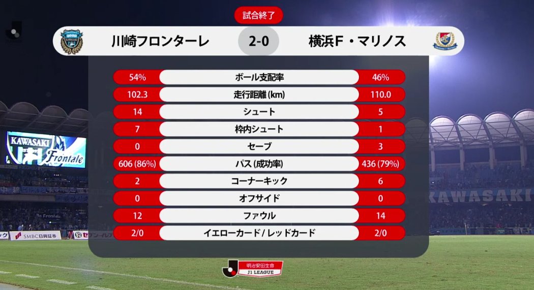 2018年第20節川崎戦スタッツ(上記画像から抽出)